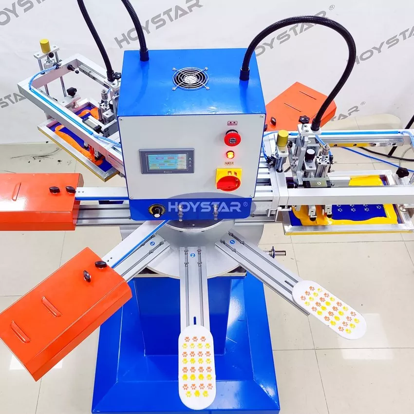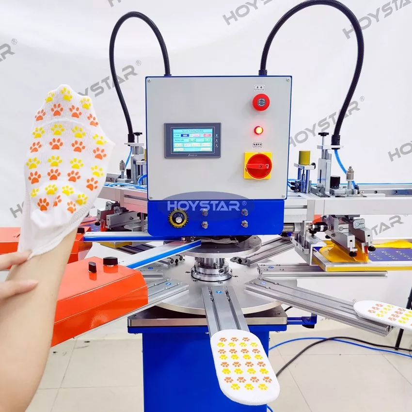 Som den profesjonelle produsenten og leverandøren er HOYSTAR High Rapid 2 Color Socks Screen Printing Machine designet for bruk i tekstilstrikkeindustrien. Med en hastighet på opptil 1000PCS/Hr er den egnet for utskrift av sklisikre sokker, babysokker, voksensokker, fotballsokker osv. Utstyrt med roterende arbeidsbord er det veldig praktisk å laste og losse sokker. PLC berøringsskjermkontroll, veldig enkel å betjene. Maskin utstyrt med tørkesystem kan tørke silisium og blekk godt.
