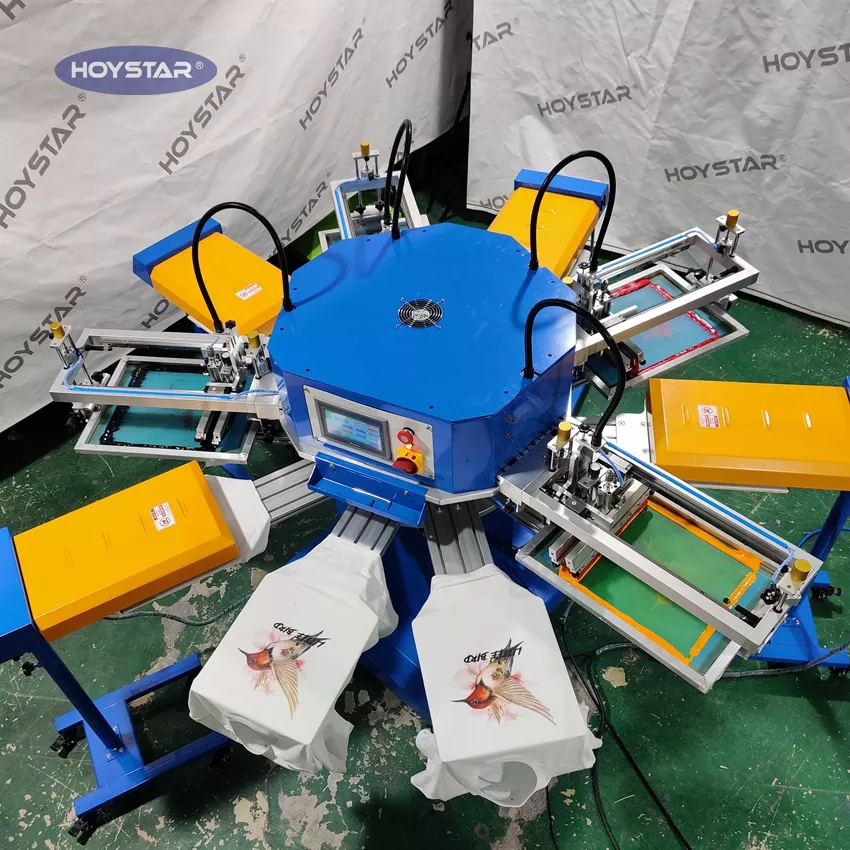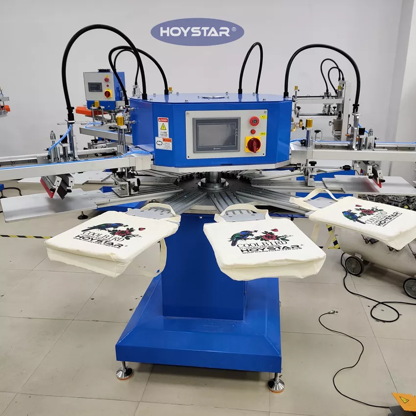 Som den profesjonelle produsenten og leverandøren, Denne HOYSTAR automatiske 4-farge poser T-skjorte silketrykkmaskin er designet spesielt for tekstilindustrien. Med en imponerende produksjon på opptil 1200 stykker per time kan øke produksjonseffektiviteten. Design for utskrift av plaggmerker, etiketter og vesker, kan endre armatur for utskrift av forskjellige typer produkt. Maskinen har et roterende arbeidsbord som tillater rask og praktisk lasting og lossing – minimerer nedetid og maksimerer gjennomstrømningen.