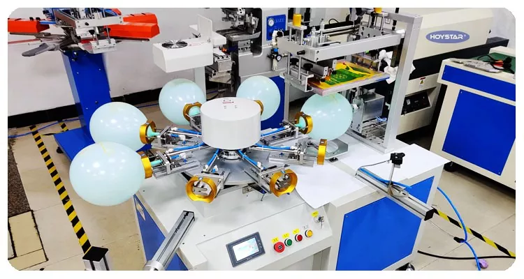HOYSTAR er en pålitelig produsent og leverandør i Kina; Denne HOYSTAR enkeltfarge lateksballongtrykkmaskinen er designet for utskrift på lateksballonger. Utstyrt med roterende arbeidsbord, automatisk blåsing, automatisk rotering, automatisk tørking, automatiske lossefunksjoner. PLC berøringsskjermkontroll, brukervennlig grensesnitt for sikker, intuitiv betjening. Maskinen kombinerer hastighet, presisjon og brukervennlighet.