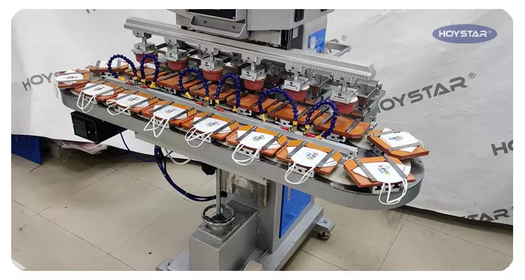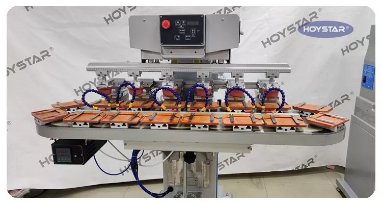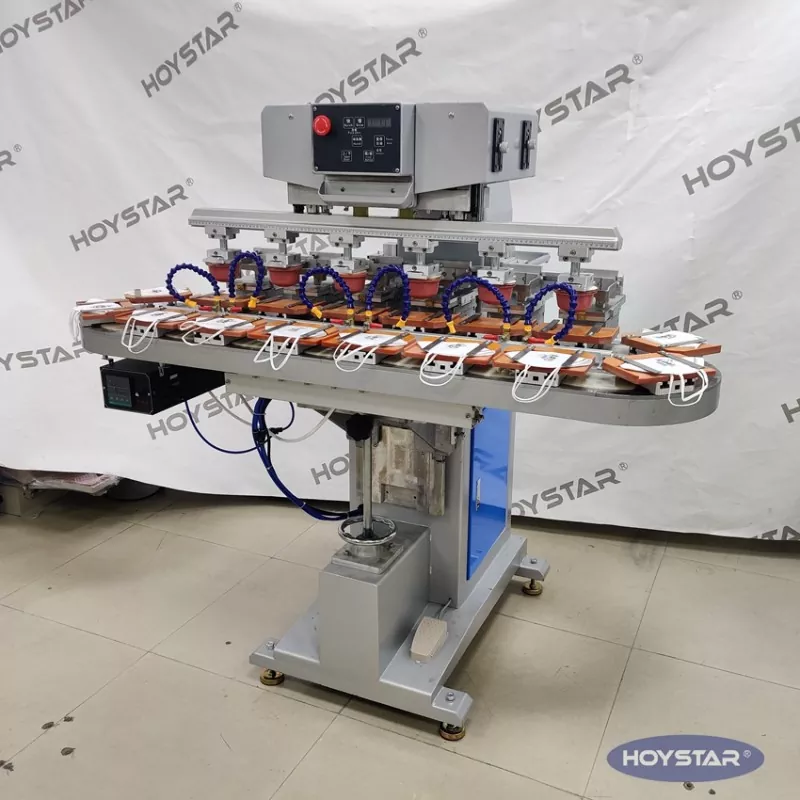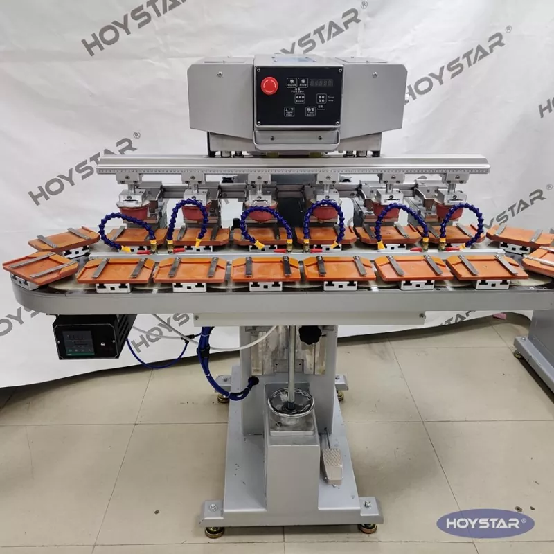 Som den profesjonelle produsenten i Kina, vil vi gjerne gi deg høyeffektiv HOYSTAR Six Color Pad-skriver med transportbånd. Denne maskinen muliggjør kontinuerlig utskrift av seks farger for produkter, med én fargeregistrering fullført i en enkelt syklus. Denne maskinen bruker roterende dreieskivetransportsystem, som muliggjør kontinuerlig og jevn produktoverføring gjennom hele utskriftsprosessen, muligheten til å fullføre full 6-fargers overtrykk på bare én rotasjonssyklus. Sammenlignet med skyttelskrivere, er hastigheten veldig høy.